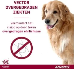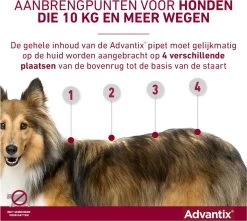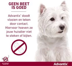 Advantix is een snelwerkend middel dat binnen 24 uur de vlooien, teken en luizen doodt. Daarnaast beschermt het middel ook nog tegen zandvliegen, muggen en stalvliegen. Beschermt de hond gedurende 2-3 weken tegen de zandvlieg, 2-4 weken tegen de mug en tot 4 weken tegen stalvliegen, vlooien en luizen. Het middel dient op de huid aangebracht te worden. Advantix doodt teken een vlooien. Daarnaast heeft het een afwerende werking op teken, muggen, zandvliegen en stalvliegen.