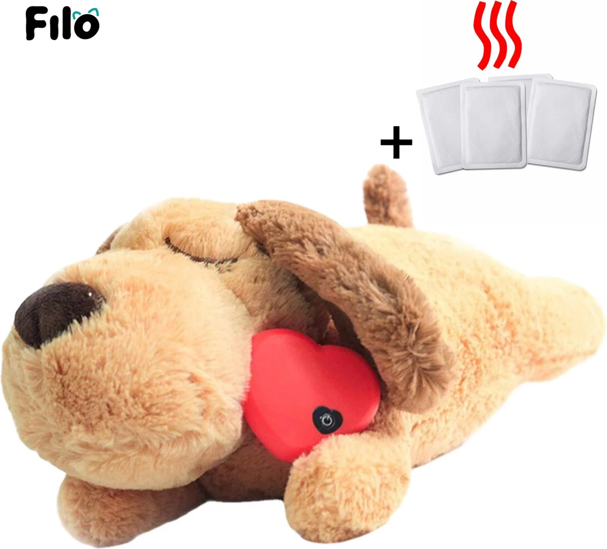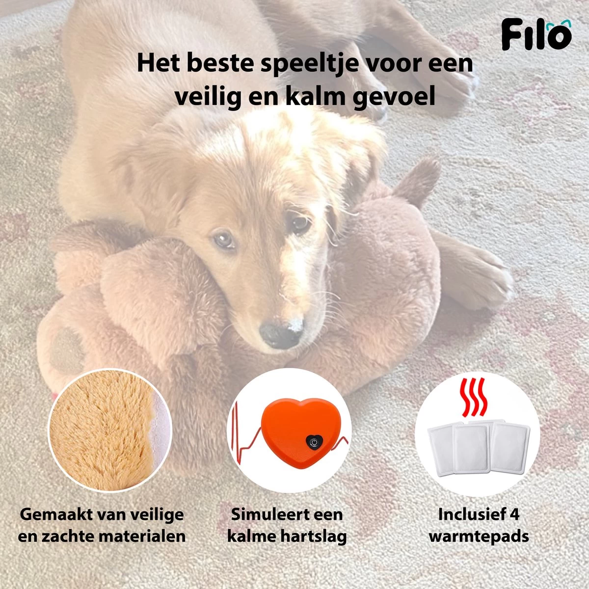Met deze schattige en zachte Filo knuffel met hartslag en warmtepads (4x) zal jouw hond zich snel veilig en kalm voelen. Het kleine hartvormige apparaatje produceert een levensechte regelmatige en kalme hartslag, waardoor de warmte en veilige omgeving van een moeder of ander familielid wordt nagebootst. Met het bijgeleverde warmtepads kan je warmte toevoegen voor extra comfort. De knuffel is gemaakt van zachte pluche materialen en biedt hulp aan alle honden die angstig of gestrest zijn, verlatingsangst hebben, slecht kunnen slapen of gewoon behoefte aan gezelschap hebben.