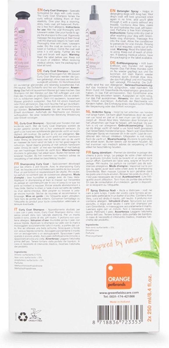 De Curly Coat Shampoo van Greenfields verzorgt de vacht zonder de natuurlijke oliën van de huid aan te tasten. De shampoo beschermt de krullende vacht tegen pluizen, geeft glans en veerkracht.