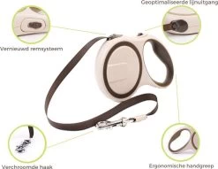 De ergonomische handgreep werd speciaal ontworpen opdat deze goed in de hand zou liggen. De hondenriem is voorzien van sterke en veilige tape en een verchroomde haak waarmee u de lijn aan het tuigje of aan de halsband kan vastmaken.