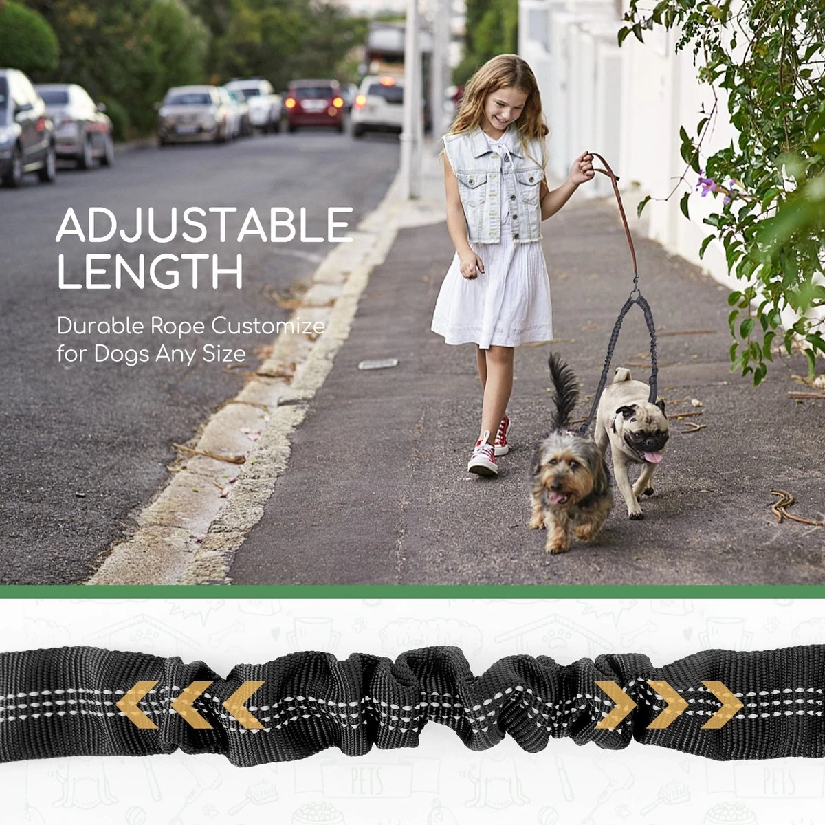 Zo kun je met twee honden aan één riem uitlaten. Beide verlengstukken hebben een elastisch gedeelte die de schokken opvangt.
