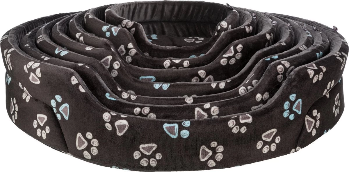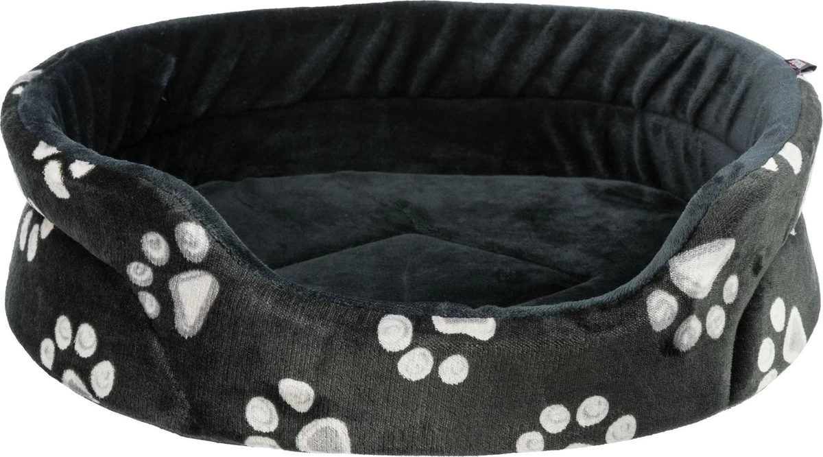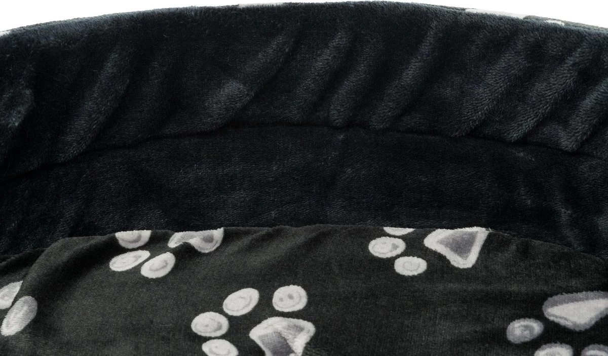 De Trixie Mand Jimmy Ovaal Zwart Met Pootprint 44 x 35 cm is een zachte hondenmand met opstaande rand en lage instap, met schuimrubber vulling, wendbaar kussen en slipvaste onderkant. Deze mand biedt jouw hond een fijne plek om in weg te kruipen. Mand Jimmy heeft een opstaande rand met schuimrubber vulling, bekleed met zacht pluche voor meer comfort en een veilig gevoel. De lage instap zorgt ervoor dat ook honden die kleiner zijn of slecht ter been zijn gemakkelijk de mand in kunnen stappen. De mand is voorzien van een wendbaar kussen en een slipvaste onderkant. Hierdoor wordt voorkomen dat de mand verschuift bij het in- en uitstappen.