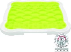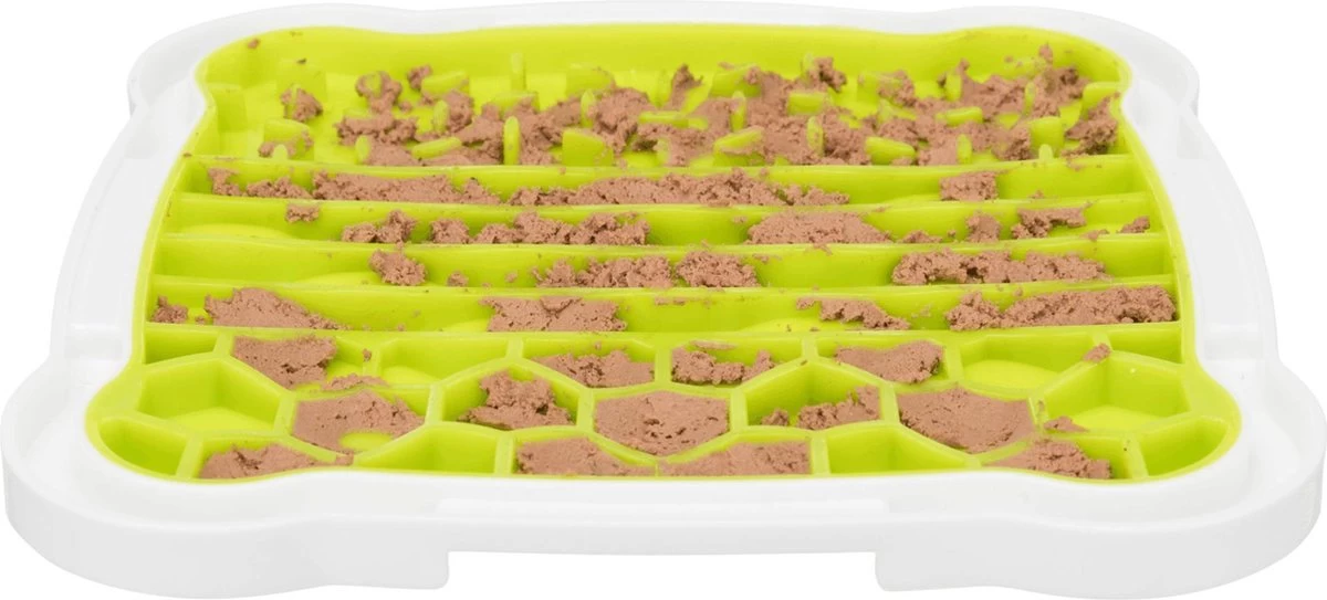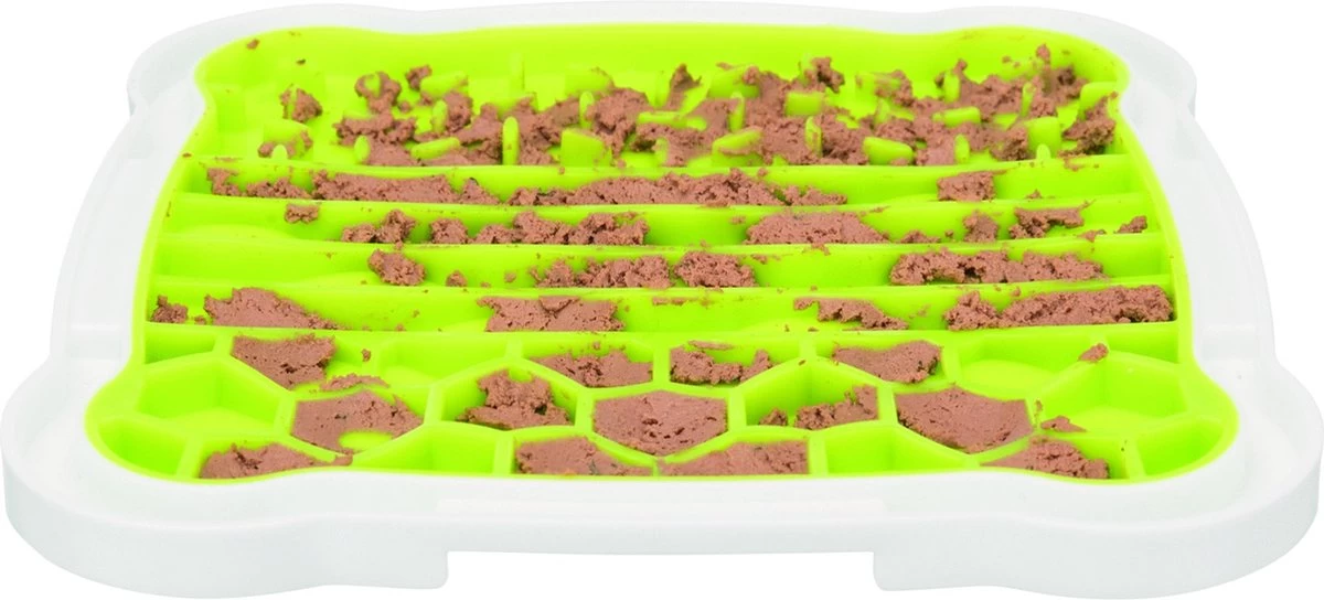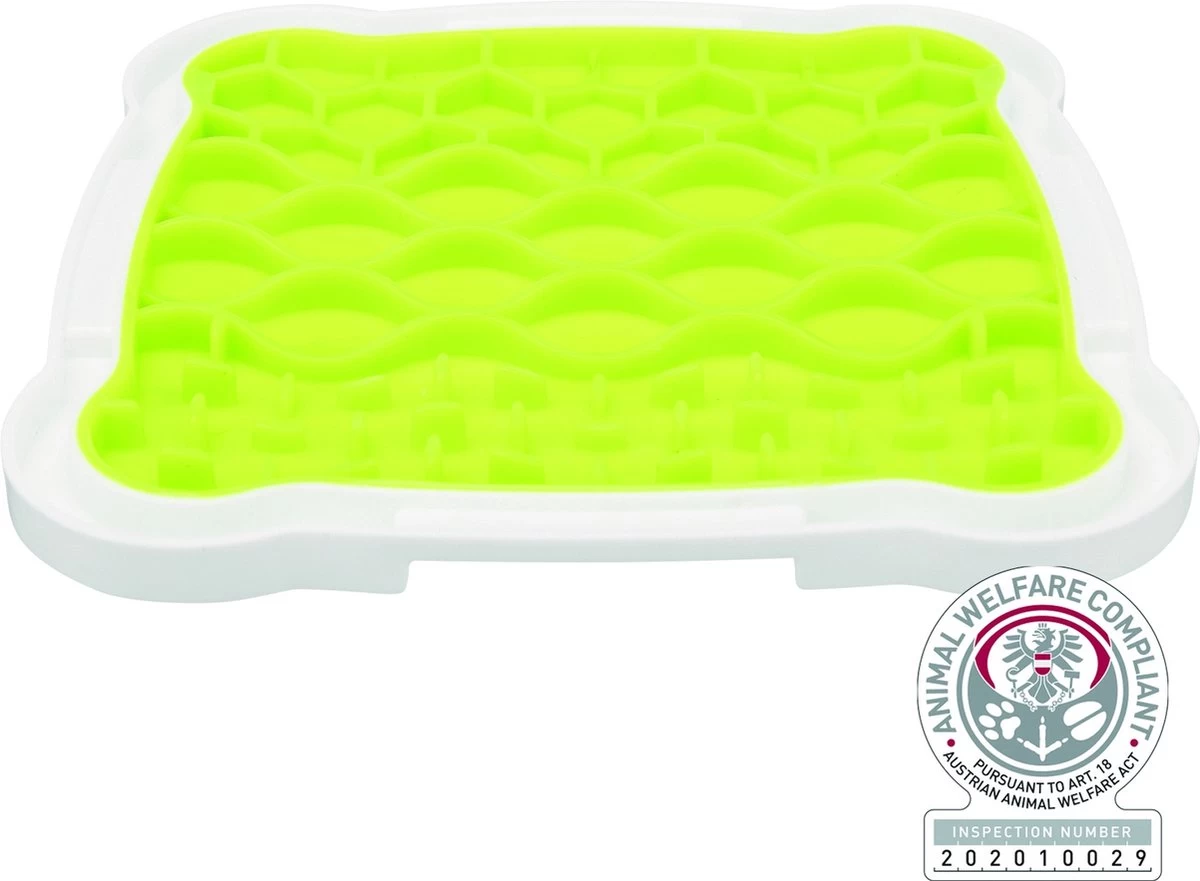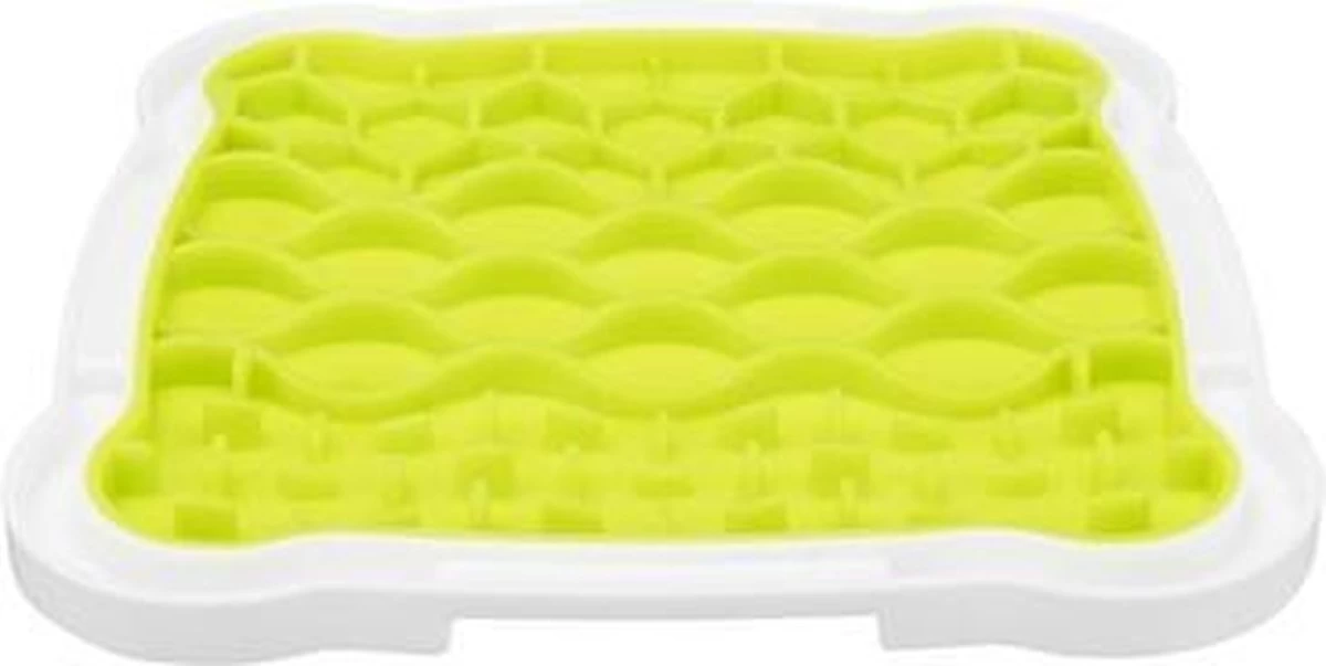 De Trixie Lick’N’Snack Plaat TPR / Plastic 20 x 20 cm is leuk hondenspeelgoed van thermoplastisch rubber waarbij de hond snacks uit de plaat moet likken om zijn beloning te krijgen. Het is bekend dat likken voor de hond kalmerend werkt en zorgt voor rust. De opname van de geringe hoeveelheid snacks zorgt voor langdurige afleidingJe kunt bijvoorbeeld paté, natvoer of zuivelproducten op de plaat smeren. Voor een extra frisse kick kun je de plaat met snacks vullen en invriezen. De handige rand vangt het vocht op en de slipvaste hoeken zorgen ervoor dat de plaat stevig op de grond blijft staan.