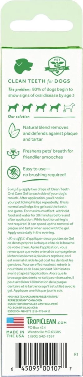 Met Oral Care Gel zorg je binnen een handomdraai voor een frisse adem. Het verfrist de adem en helpt bij het verwijderen van tandplak en tandsteen. Voor Oral Care Gel heb je geen tandenborstel nodig en hoef je niet te poetsen. Je breng het product rechtstreeks aan op de tanden en het tandvlees door dagelijks twee druppels aan beide zijdes van de bek te doseren. Je hond zal zelf het product over het gebit verspreiden met z’n tong en lippen. Binnen 30 dagen zal je zien dat je hond schonere tanden heeft (bij dagelijks gebruik).